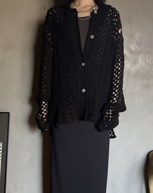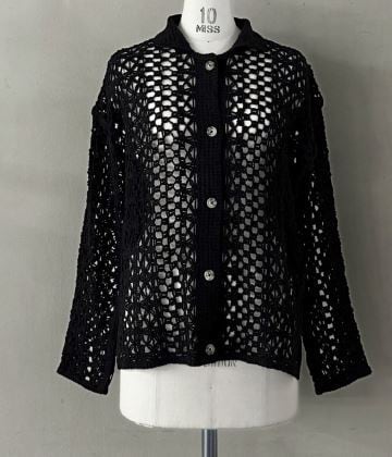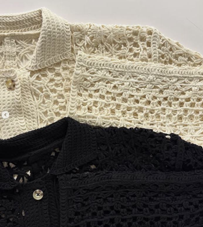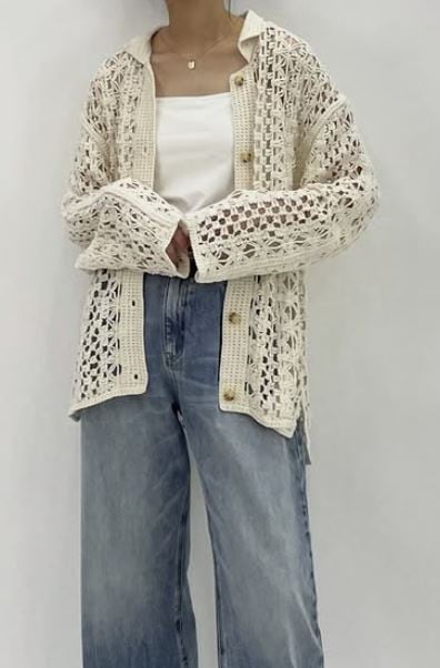 流行のクロシェ編み(編み目が粗くかぎ針編みのこと)の」ちょっと長めのシャツカーデガンです。