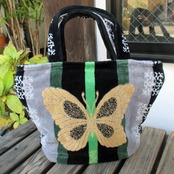 横浜ナナの小さめなバッグ、開口部は安心のファスナー、取っ手は共布のタオル地です。