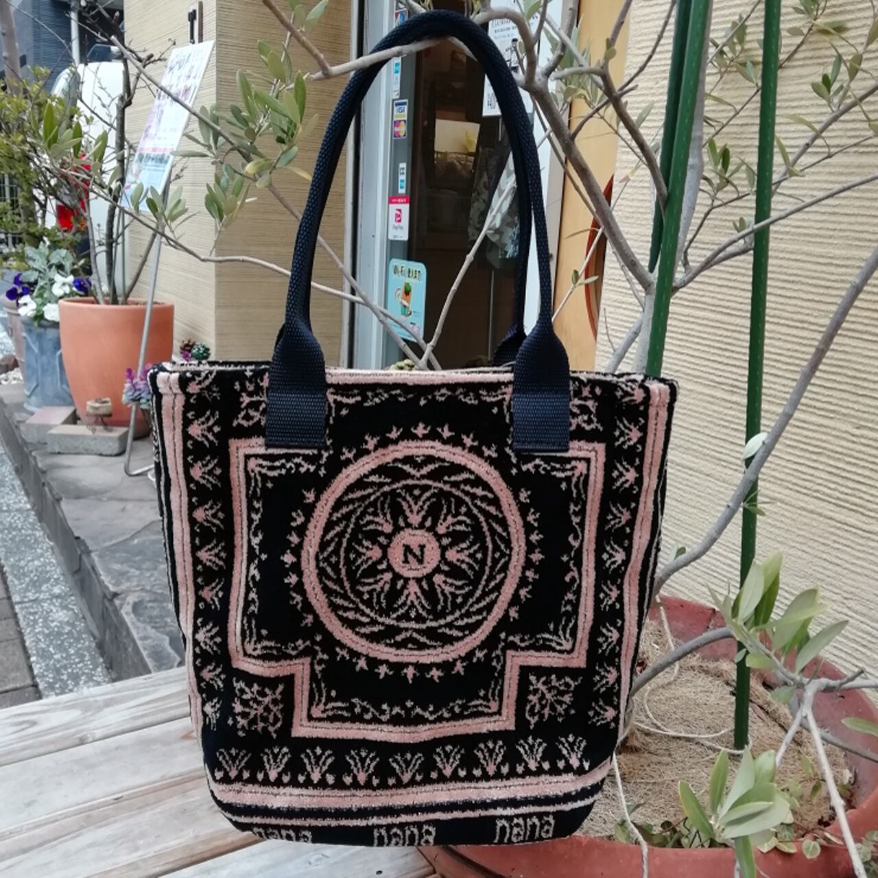 横浜ナナ バッグ小 黒/ベージュ ドーム柄