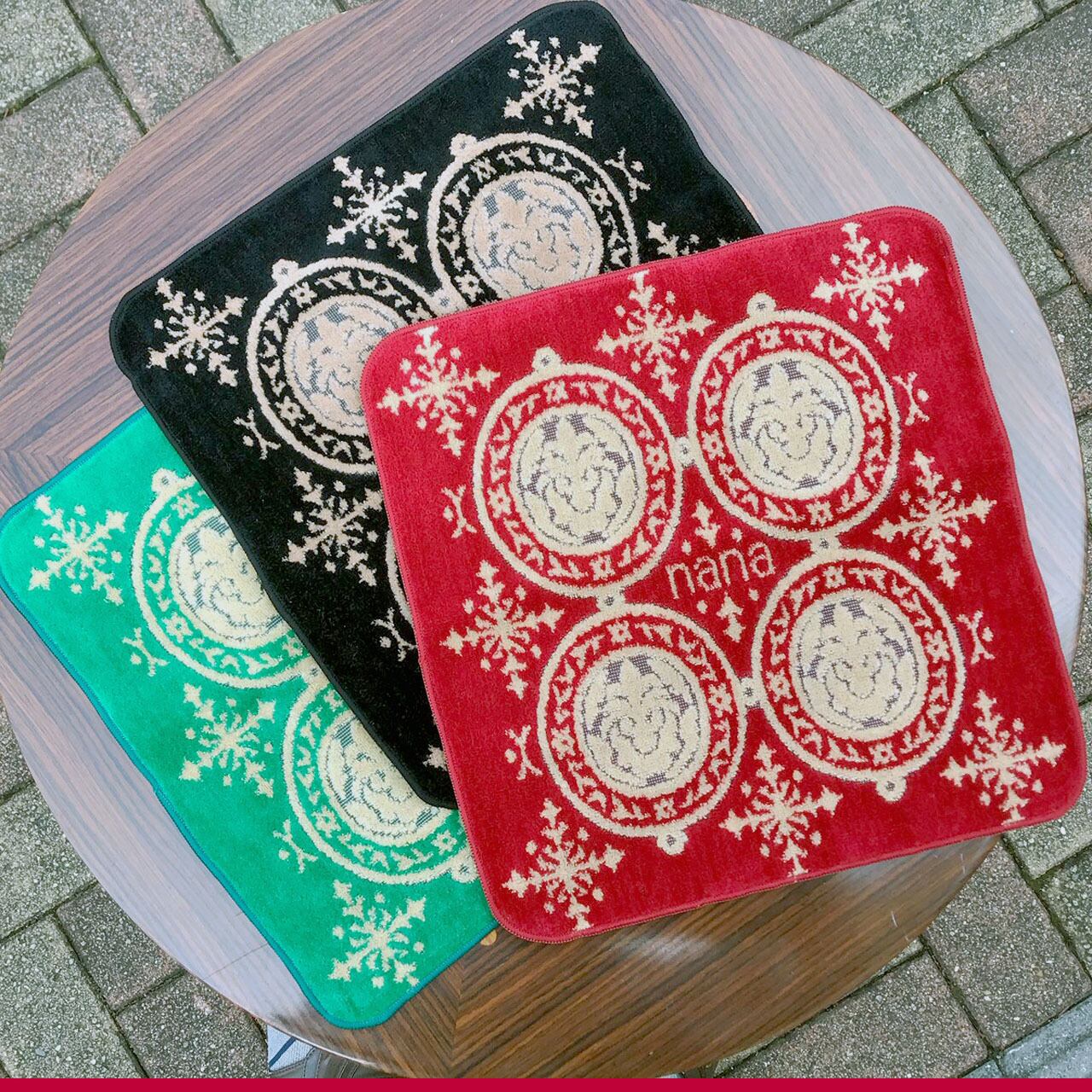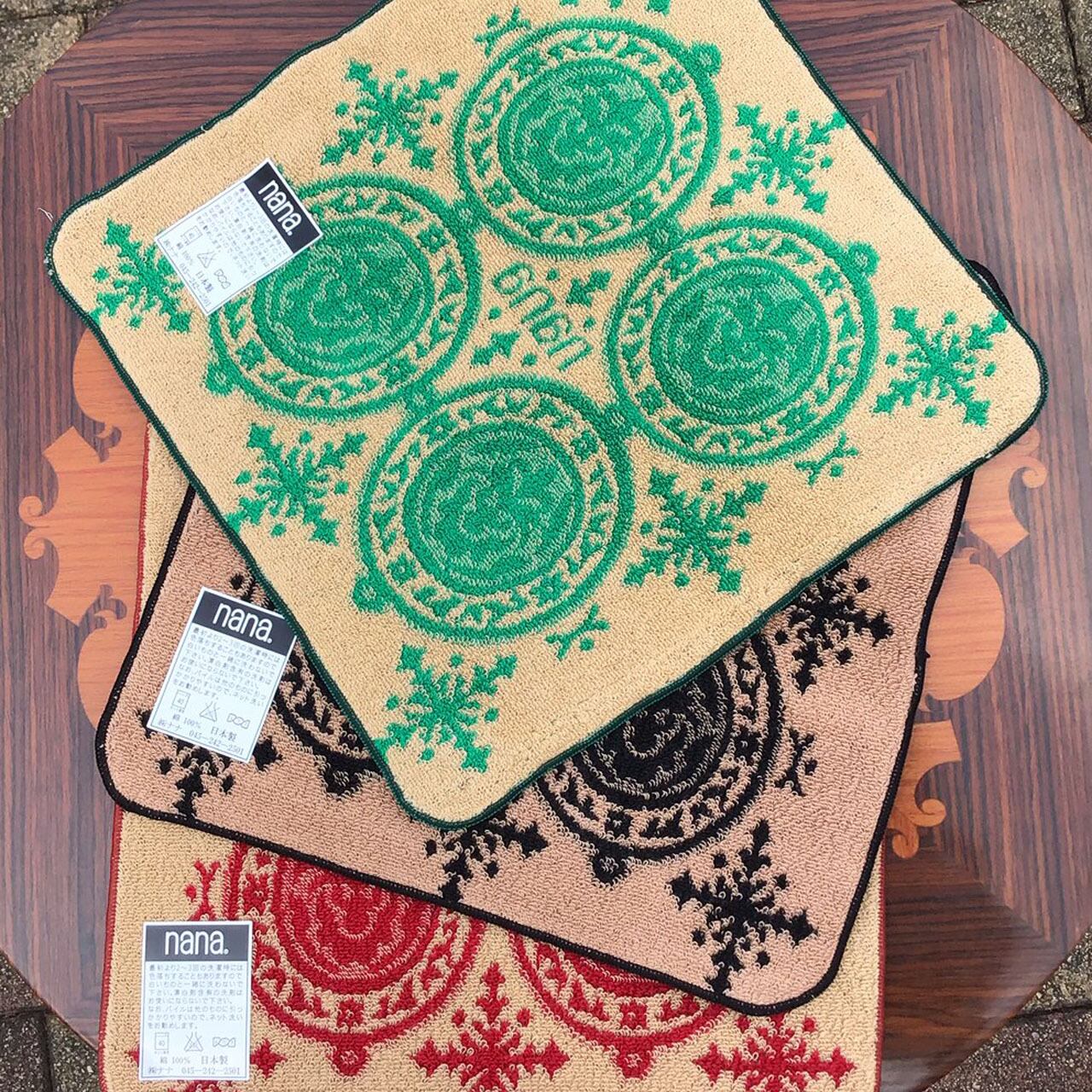 横浜ナナの今年一番のヒット柄「マリン」、お色も定番の黒/ベージュ・グリーン/ベージュ・赤/ベージュのお試しミニウオッシュ(25x25cm)三枚セットです。