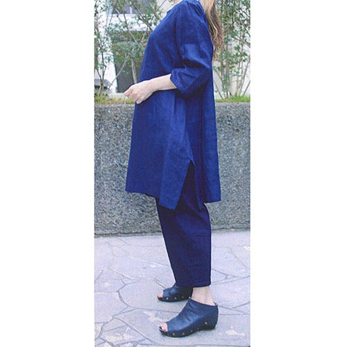 肩マチ、裾スリットのさりげなさが着こなしの幅を広げてくれます。光沢のあるリネン100%の藍染は春夏にぴったりの素材感です。