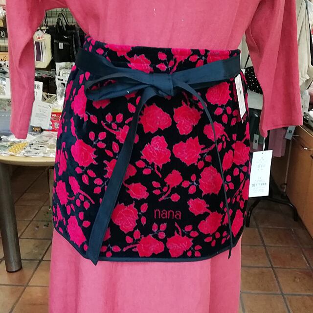 横浜ナナ ショートサロンエプロン ブラック&レッドのローズ柄