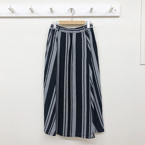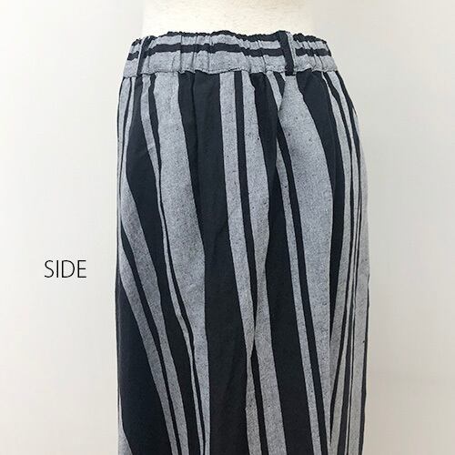 加工により、レーヨンのドレープ感とリネンの節感をより強く出した、粋なランダムピッチストライプ生地柄のスカートです。