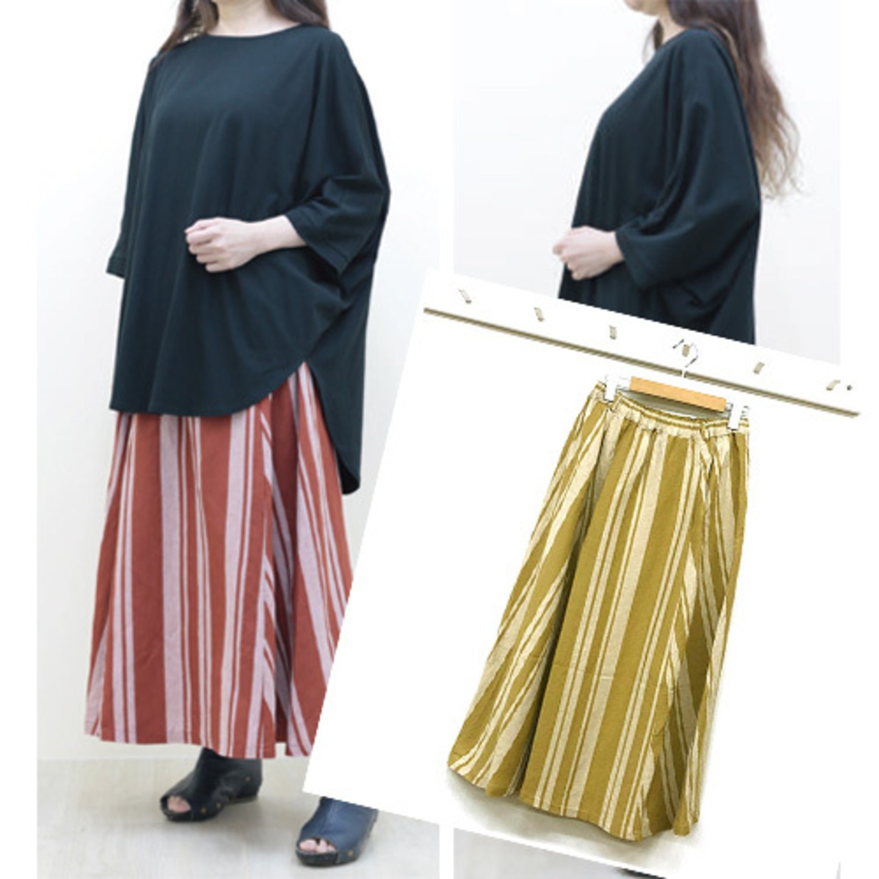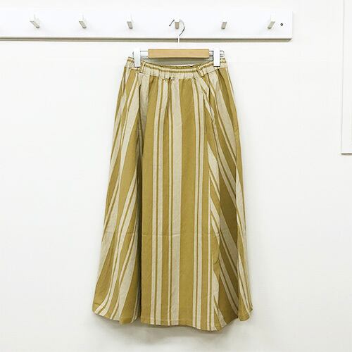 加工により、レーヨンのドレープ感とリネンの節感をより強く出した、粋なランダムピッチストライプ生地柄のスカートです。