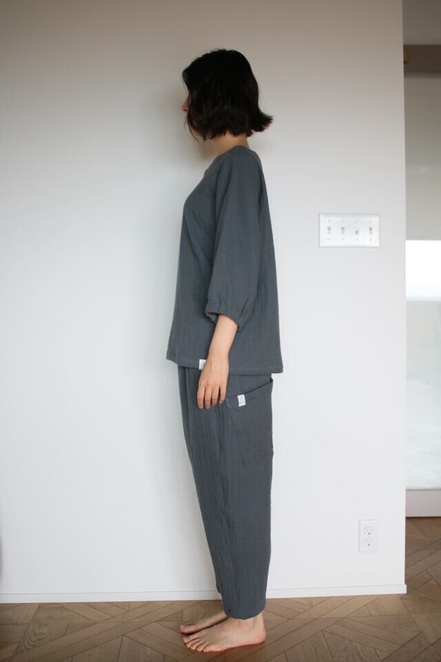 同素材でボトムを作っていますので、セットアップで着てもらえると、おうちで、リラクシングウエアーとして、オンオフどちらでも使えるアイテムになっています