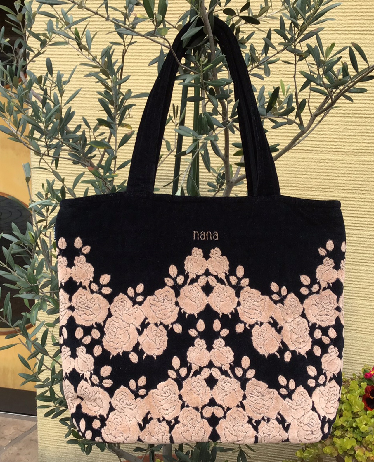 久々入荷! 横浜ナナ トート大 黒/ベージュ ローズ柄