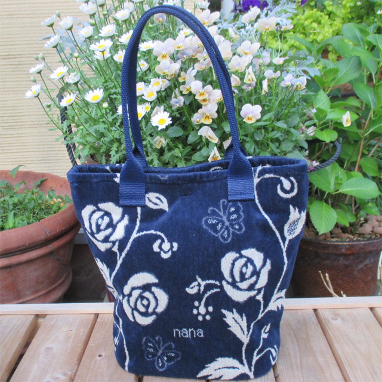 普段使いの 横浜ナナ バッグ(小) 紺/白のローズバタフライ柄