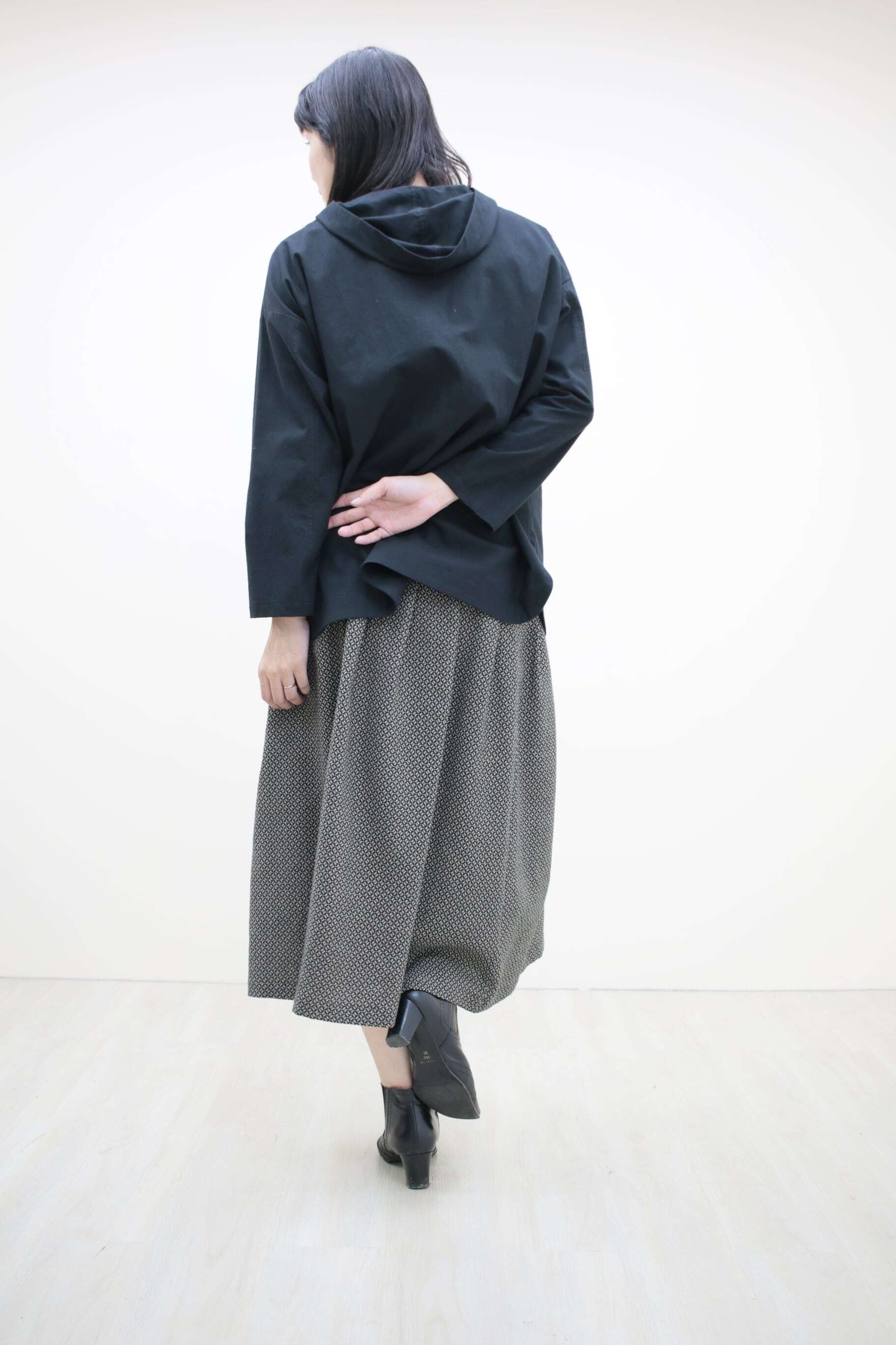 前からは立ち襟に見え、後ろからはフードに見えるデザインで
