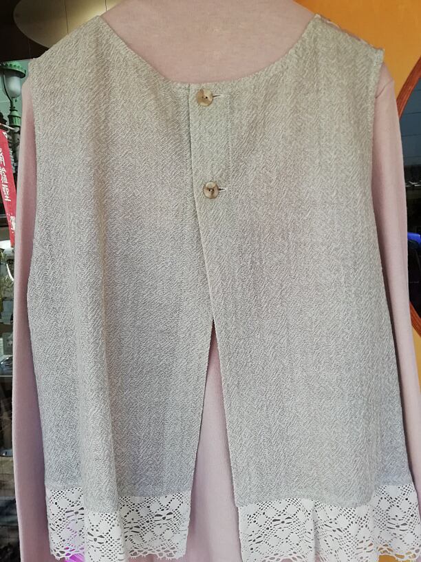 前身頃は刺繍、後見頃はウールガーゼに二つ釦、裾にはぐるりとソフトタッチのコットン100%のトーションレースを縫い合わせました。
