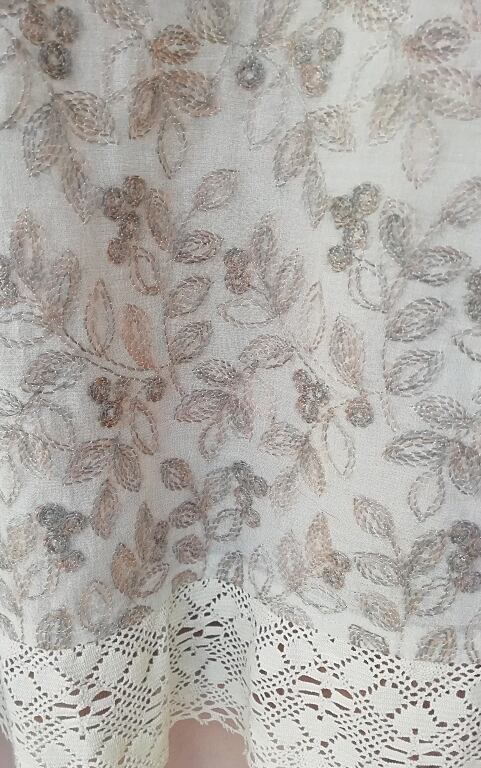 細番手の柔らかなコットンシフォン素材にウールの糸を2色一緒に引き揃えて刺繍をかけました。