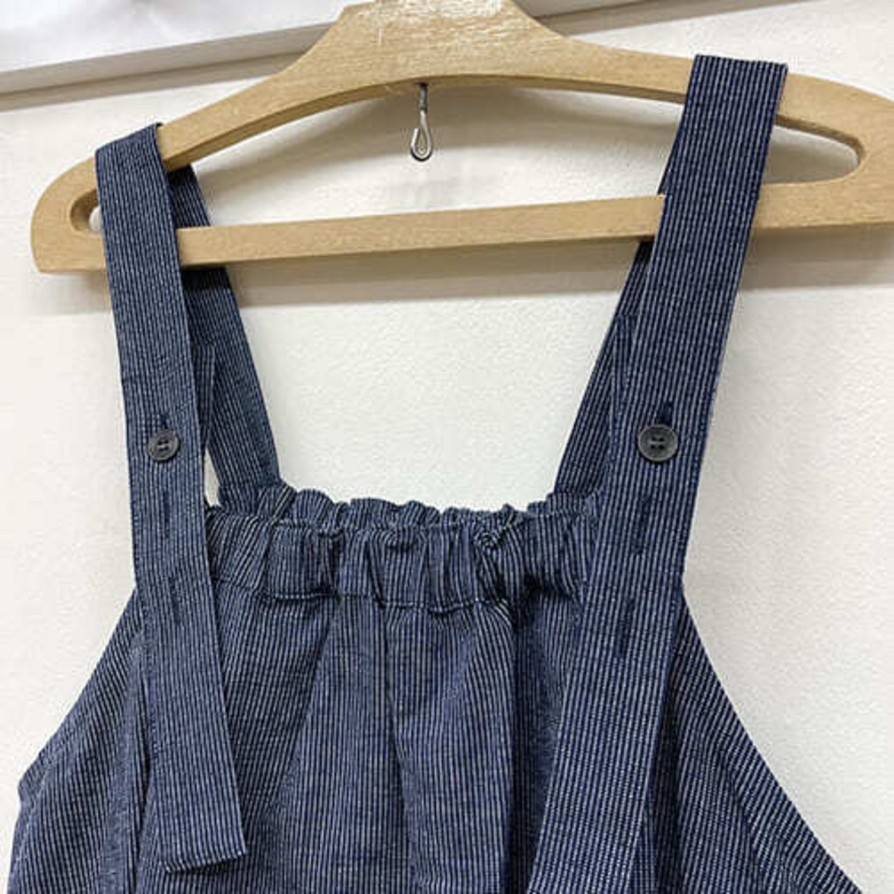 藍染ストライプ柄のサロペットスカート。肩部分がボタンで調節できます。お好きなトップスと合わせて♪