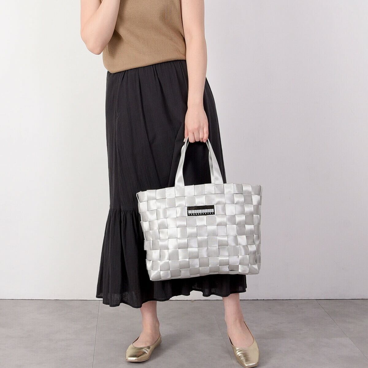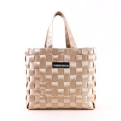 光沢感のある太幅のテープをメッシュ状に組み合わせたトートバッグ。